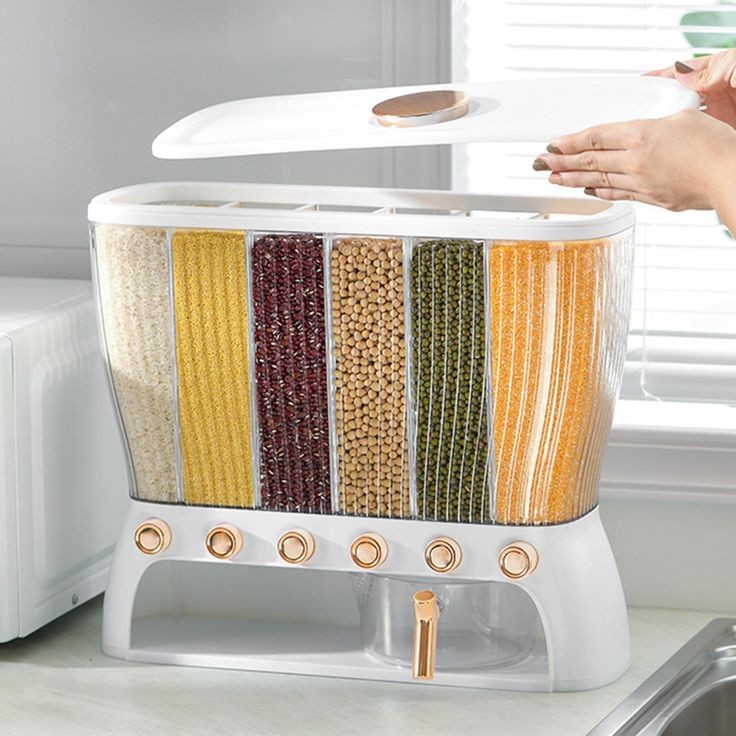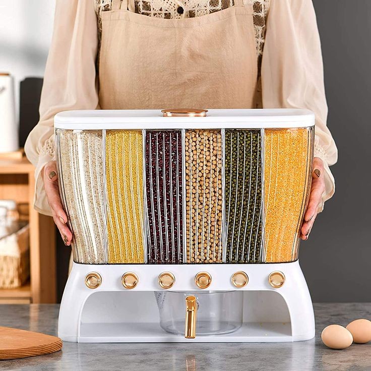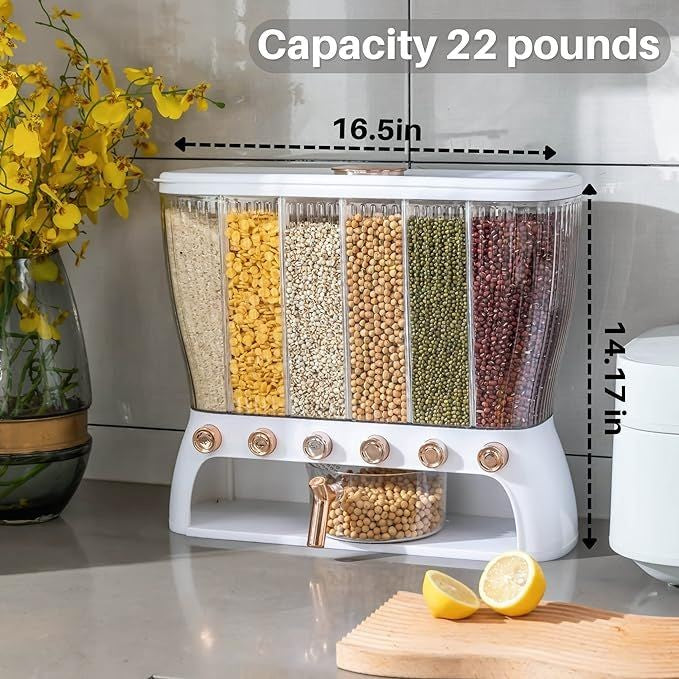 Convenient and organized storage: Our 6-grid dispenser provides a large capacity solution for storing various small food particles, such as rice, millet, black rice, corn, red beans, and mung beans. It helps to keep your kitchen tidy and saves valuable space.
