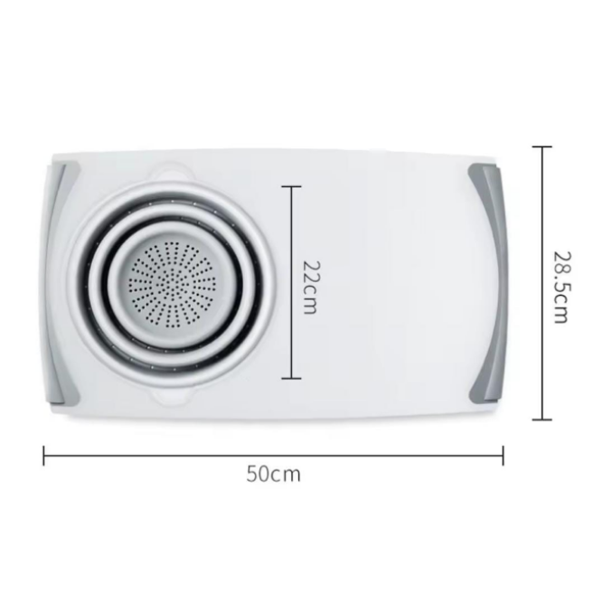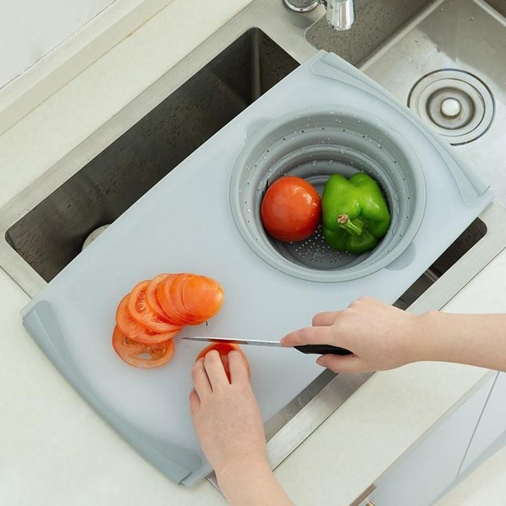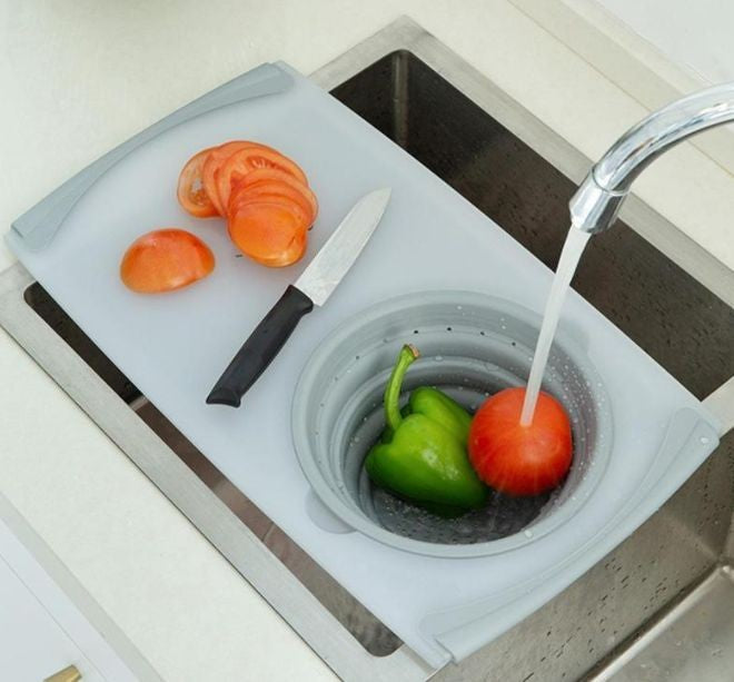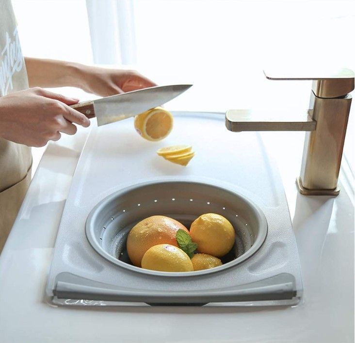 GRAY FINISH : Featuring a gray finish, this collapsible cutting board strainer perfectly blends with all kinds of kitchen supplies. Sleek rectangle design to effortlessly fit over most sink.