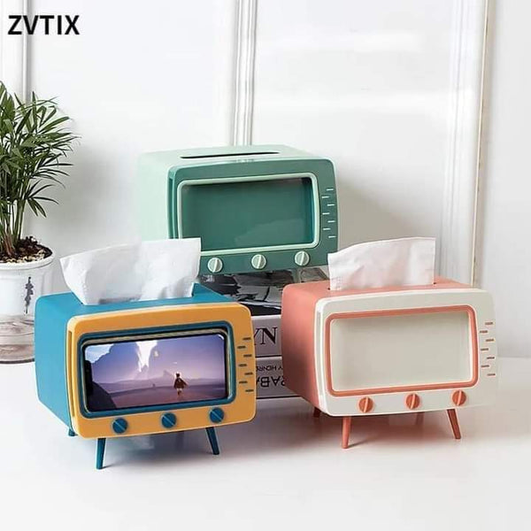 2 In 1 Tissue Box With Phone Stand Tv Appearance Creative Square Home Office Desktop Tissue Boxes Storage Organizer