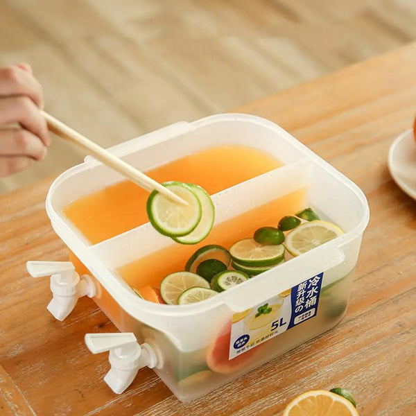 2 portion juice dispenser in fine plastic quality with a capacity of 5L. Both for juice and water