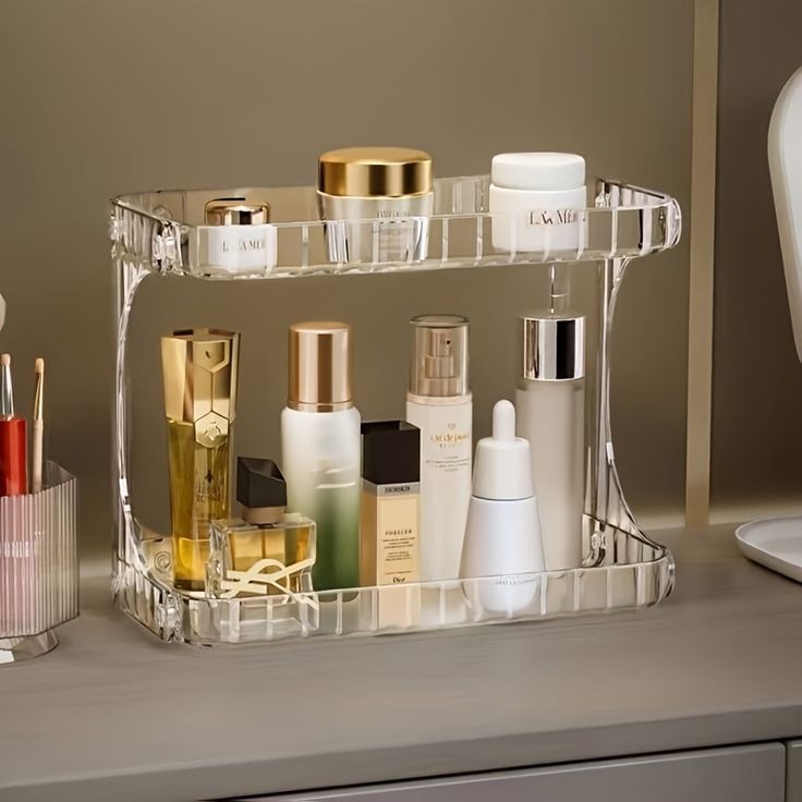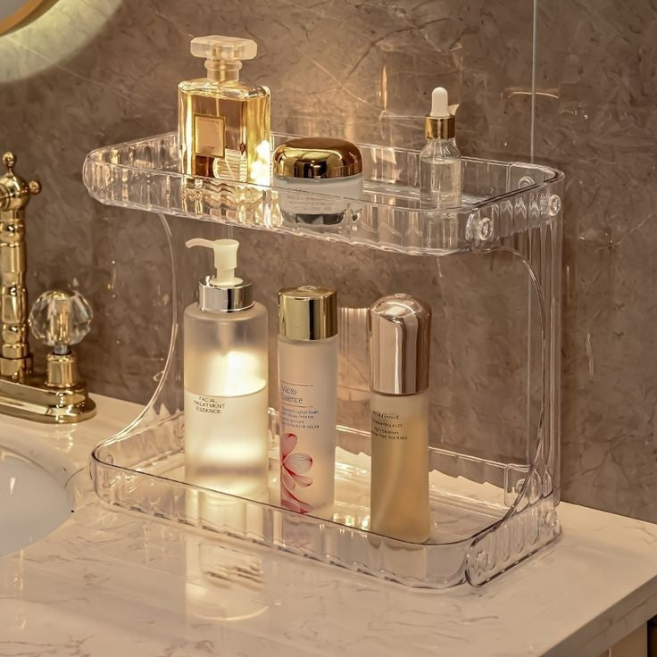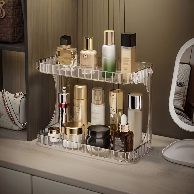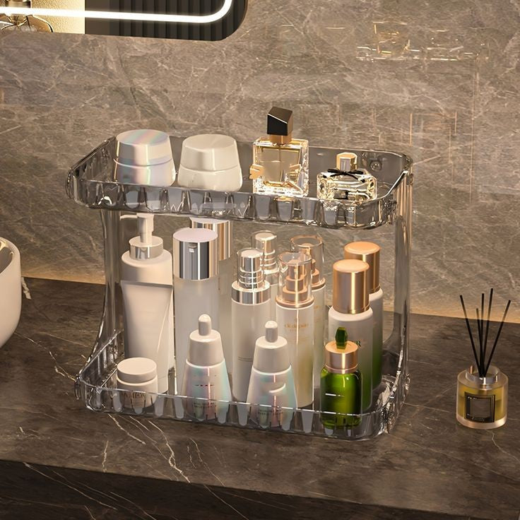 Bathroom Counter or Vanity Makeup Organizer - This elegant 2-tier organizer tray helps organize your bathroom or vanity countertop. Keep your toiletry and cosmetic makeup organized. Clear design is suitable for various styles of home decoration.