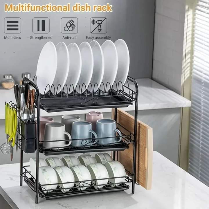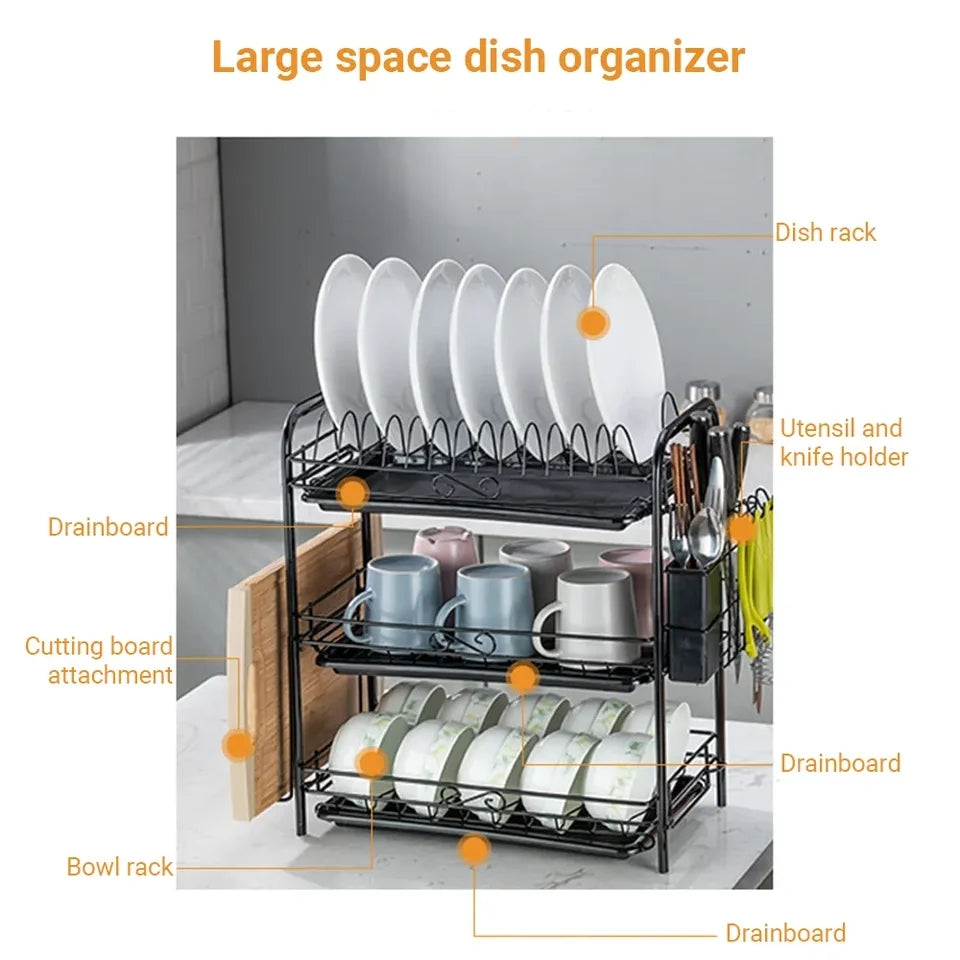 TIER PLATE ORGANIZER : Elegant 3 tier plate organizer, efficient dish drainer. The upper and lower tray that can be extended to the sides to store cutting boards and kitchen utensils, ensures that the plates, dishes and cutlery are organized and tidy.