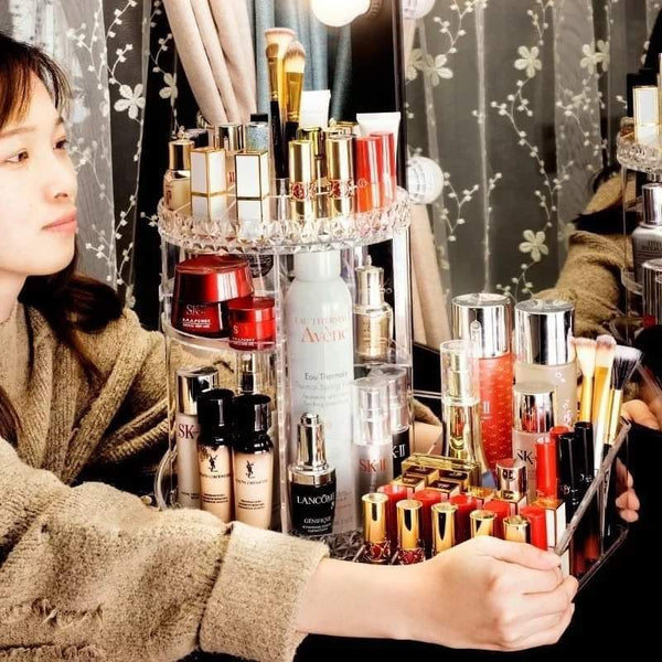 360 degree rotating cosmetic organizer with lipstick organizer tray