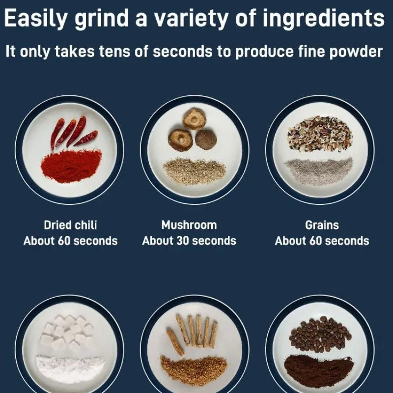 【Professional Grinding Blade】: The blade is made of high-quality 304 stainless steel and can handle spices, grains, dry herbs, seeds, nuts, coffee beans, etc. The improved shape of the blade enables all-round 360° grinding and activates the original aroma of food.