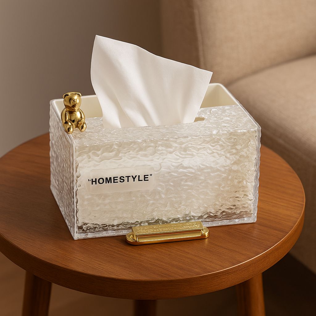 This acrylic water texture tissue box is a stylish and multifunctional organizer designed to enhance the look of any space while providing practical storage. Featuring a sleek acrylic body with a unique water texture design, it adds a modern touch to your home or office decor. The box serves as a versatile tissue holder and napkin organizer, offering easy access to tissues and napkins while keeping them neatly stored and dust-free. Its durable construction ensures long-lasting use, and its compact size makes it a perfect fit for any tabletop, countertop, or desk.