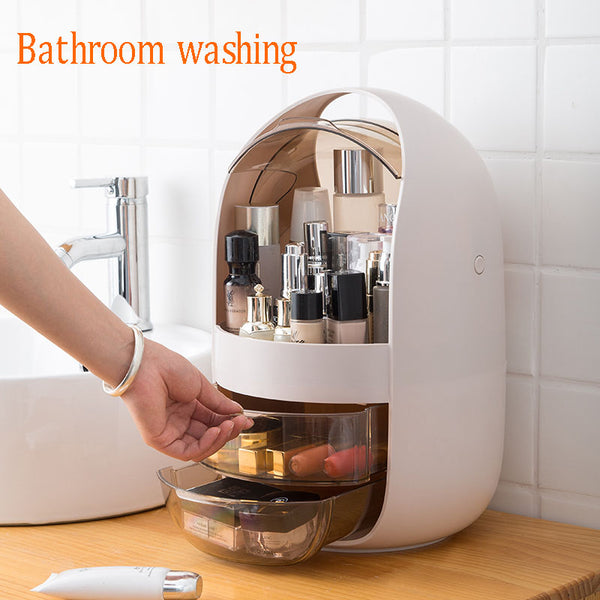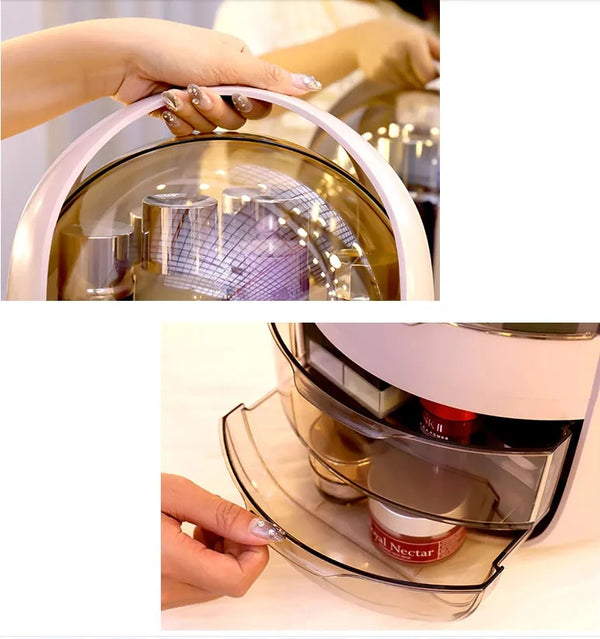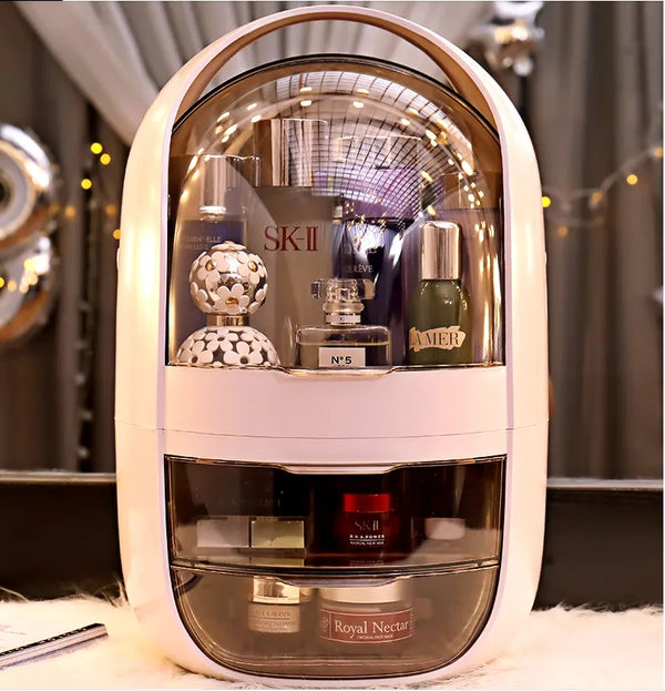Big size cosmetic organizer with drawers having an option to open on both sides. Having drawers at the bottom. Having option of holding organizer for carry purpose.
