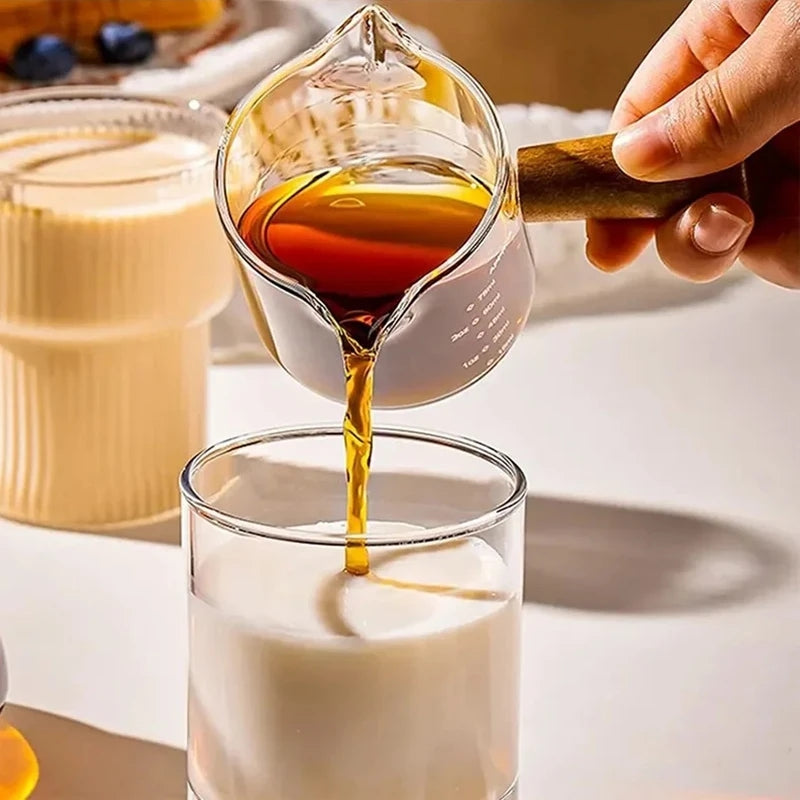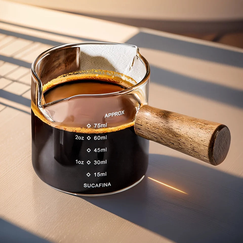 【Good Performance】This espresso measuring cup is fired at high temperature, you can pour hot water into the frozen glass, no need to worry about bursting, with anti-scalding wood handle, it fits your hand perfectly, and it is thermally insulated. The measuring cup is printed with a clear and accurate scale, which is not easy to fall off. The clear scale allows you to easily measure without using a measuring spoon, which brings you great convenience.