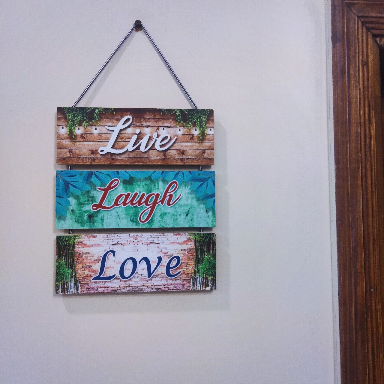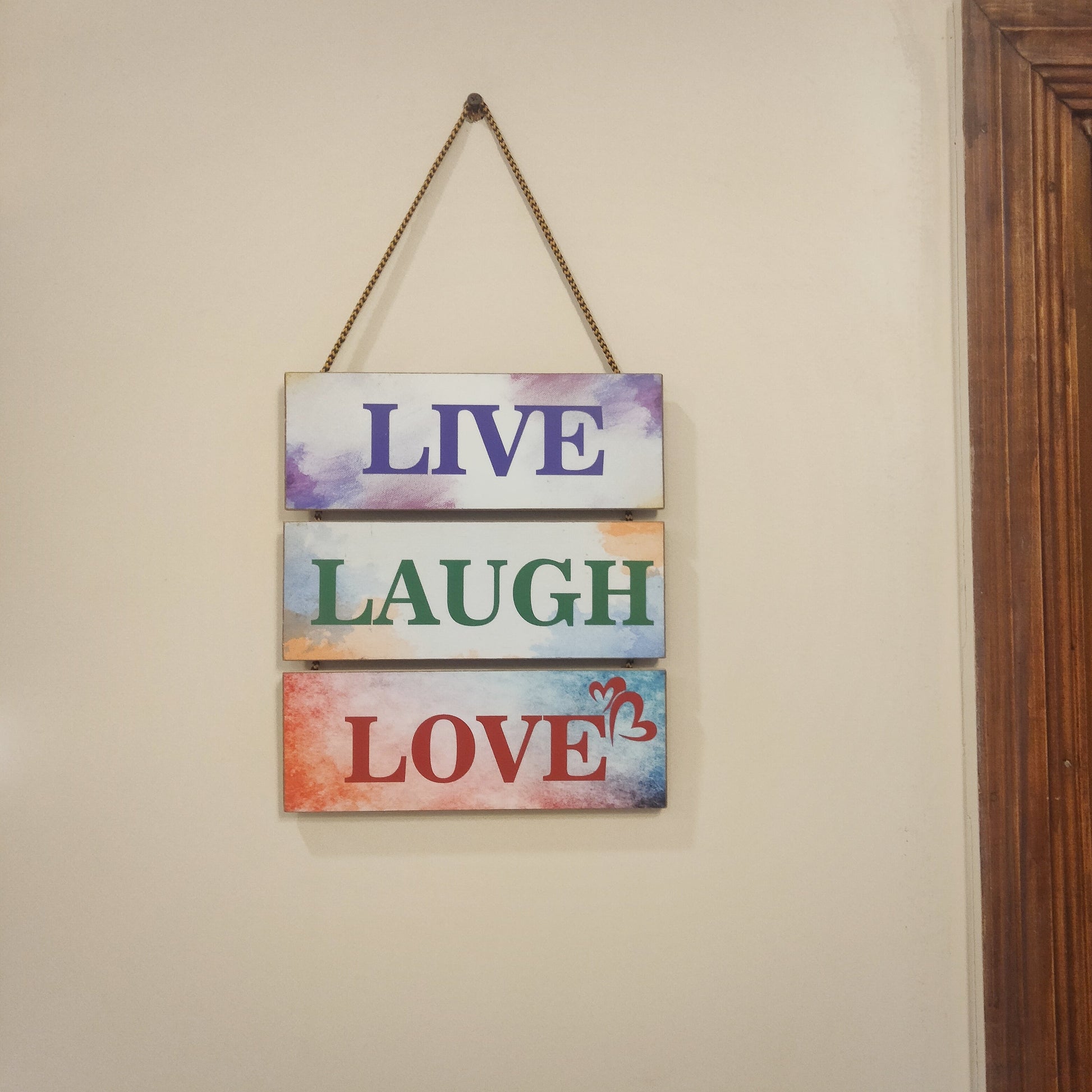 This eye-catching wall decoration features the classic "Live, Laugh, Love" quote in a bright and vivid color design. It provides a stylish way to add a touch of English charm to any room. The text is printed on a durable wooden material, making it perfect for long-lasting decoration.