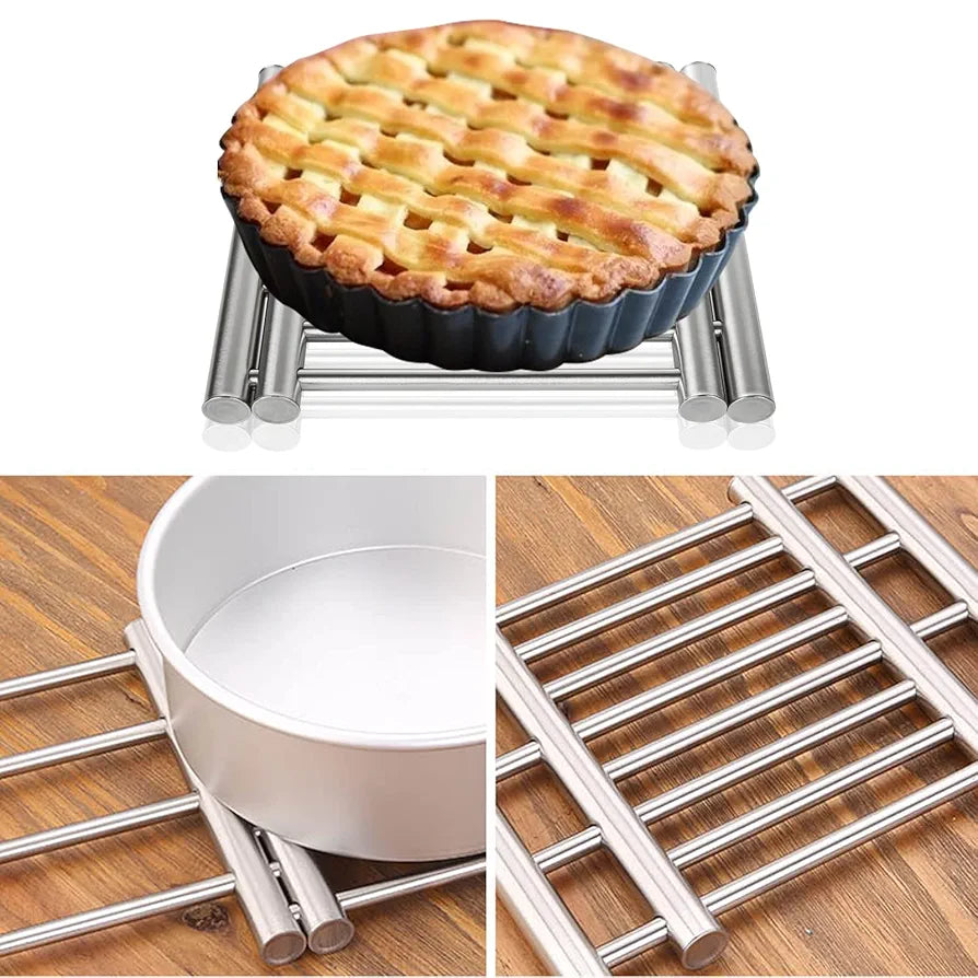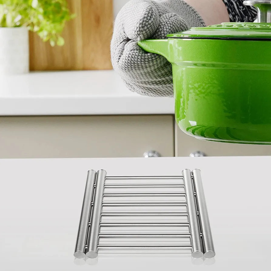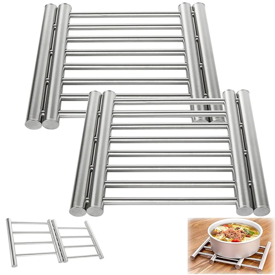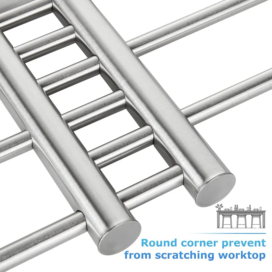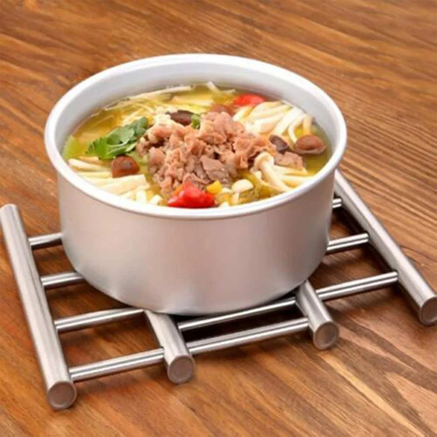 PREMIUM QUALITY Made of sturdy stainless steel material, these lightweight metal trivets for hot pans can hold any hot pans or pots to protect the tabletop from damage. Its smooth, rounded edges of this stainless steel coaster can prevent other items from being scratched nearby.