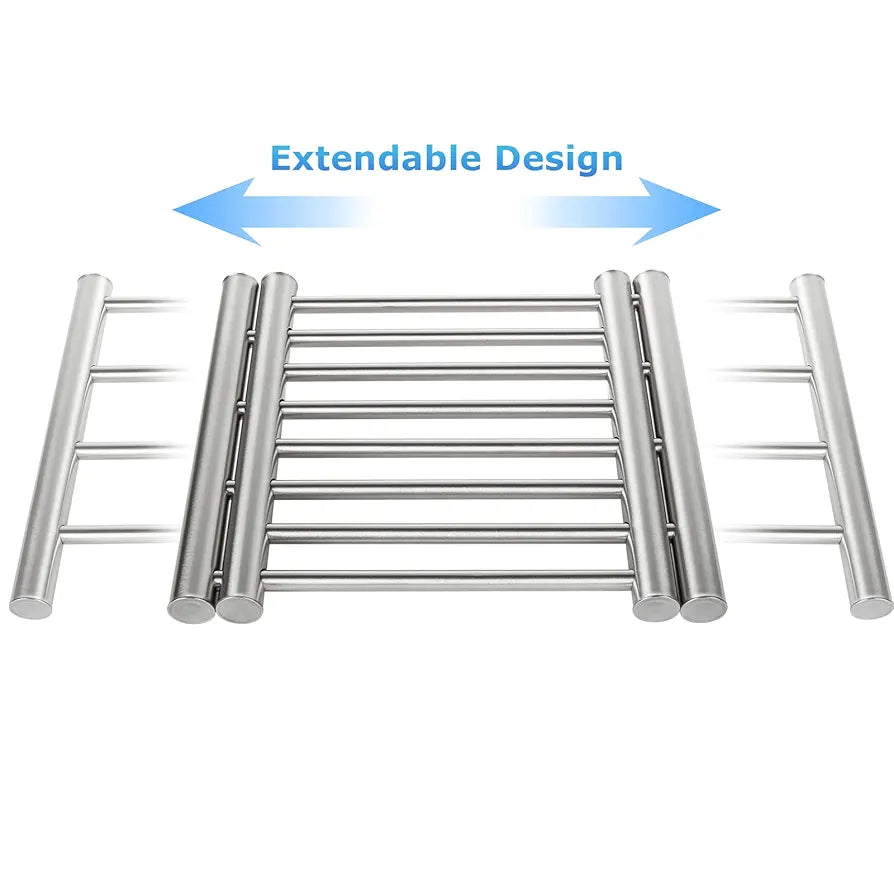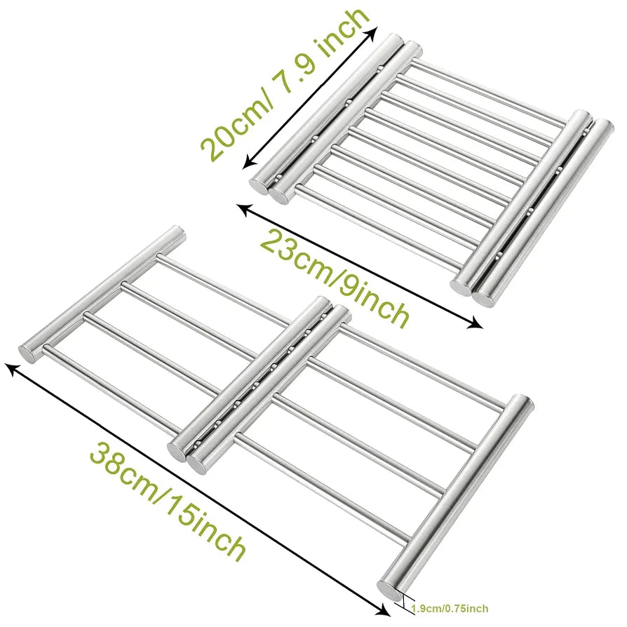 Foldable and expandable: these expandable metal coasters for kitchen worktops can be easily stored in a drawer in the kitchen when not in use. In addition, the metal kitchen trivets can be expanded to safely place more pans and trays on it.