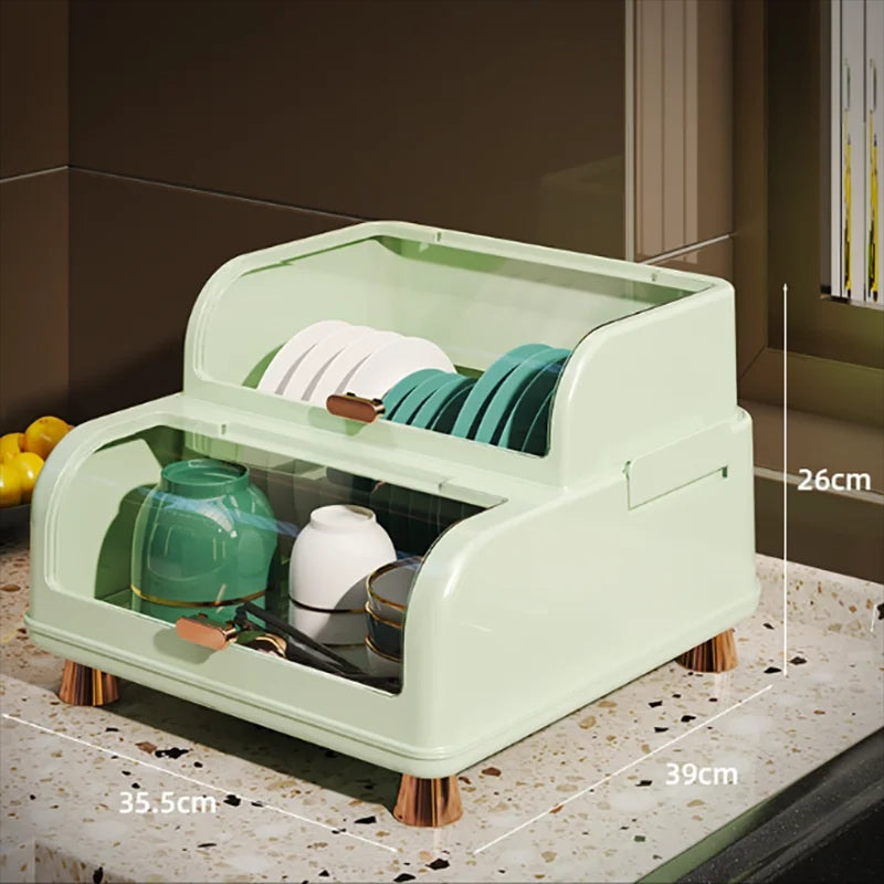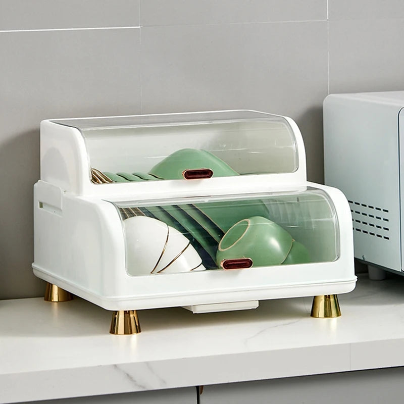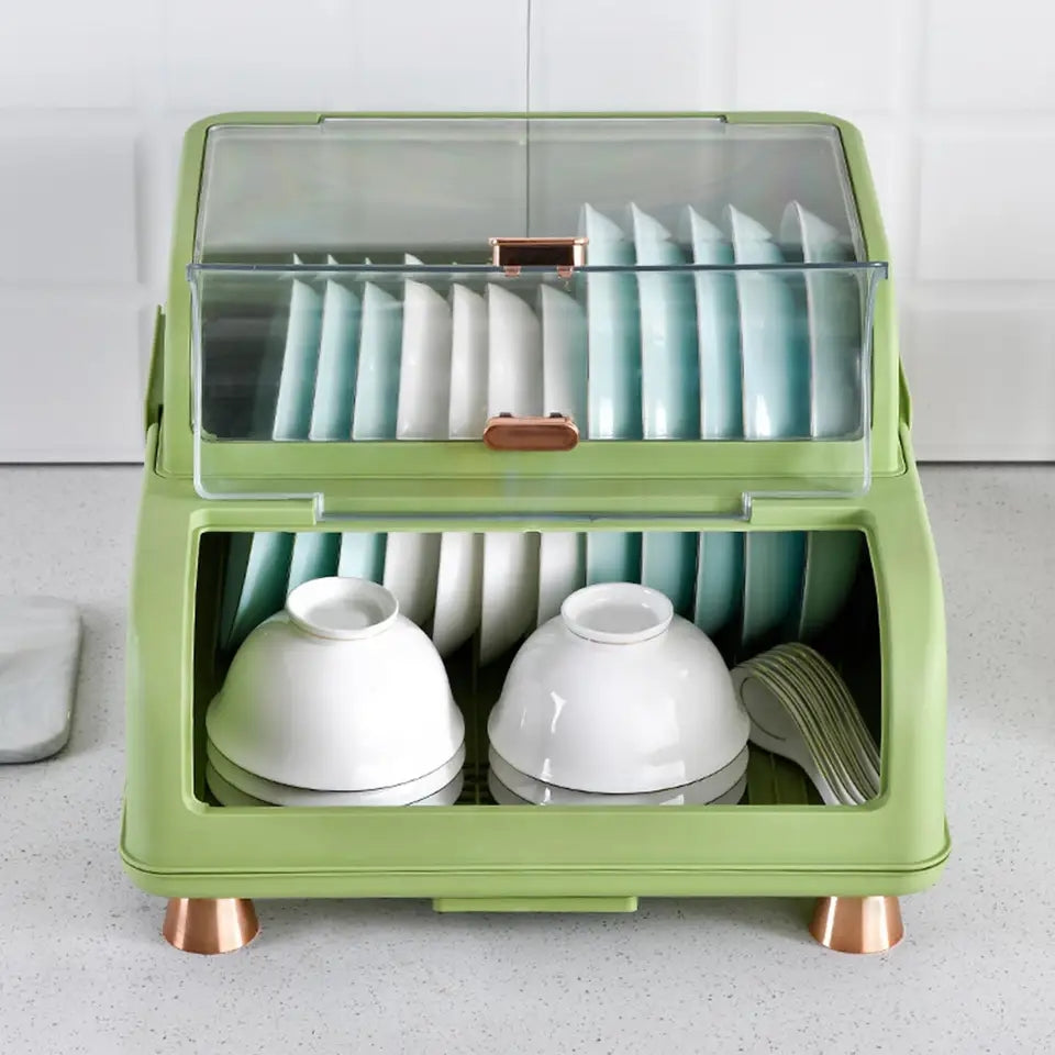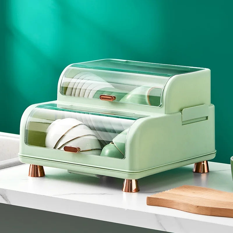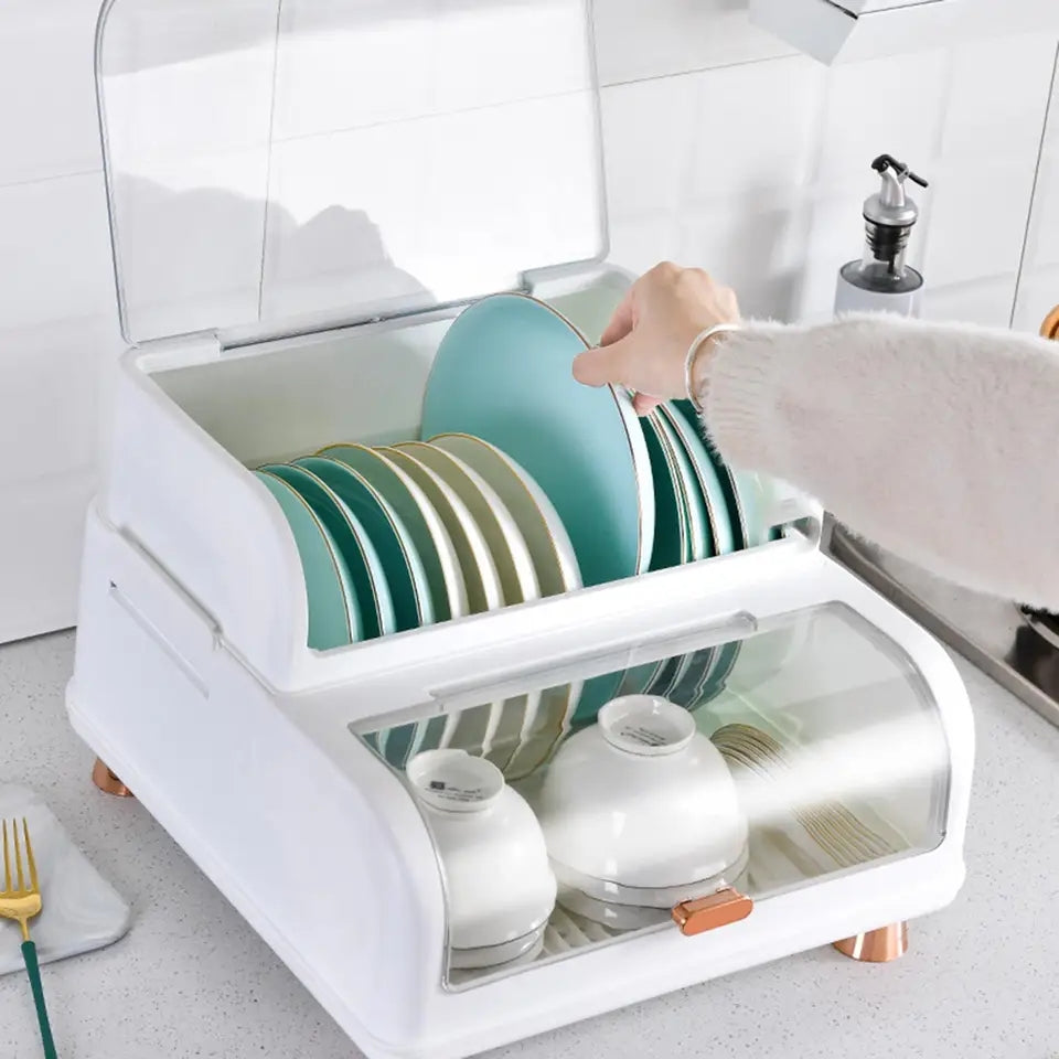This durable and efficient Dual Layer Dish Rack with Lid is perfect for organizing your kitchen and saving space. The two layers allow you to store twice as many dishes, while the lid keeps them clean and protected. Save time and effort with this essential kitchen tool.