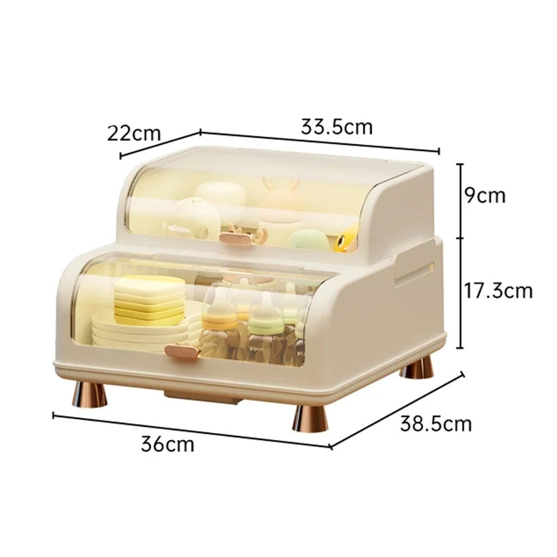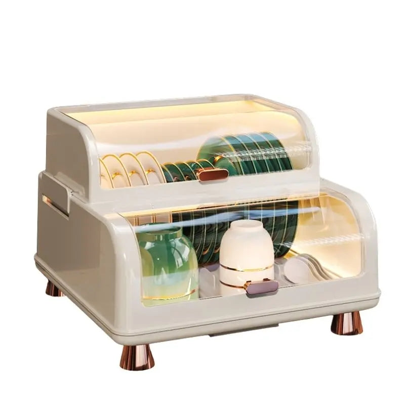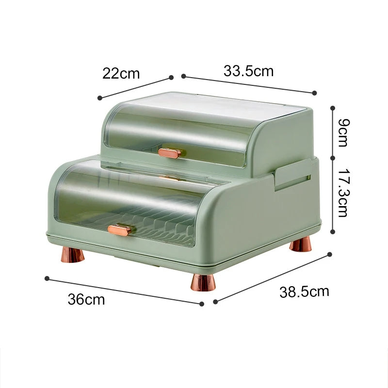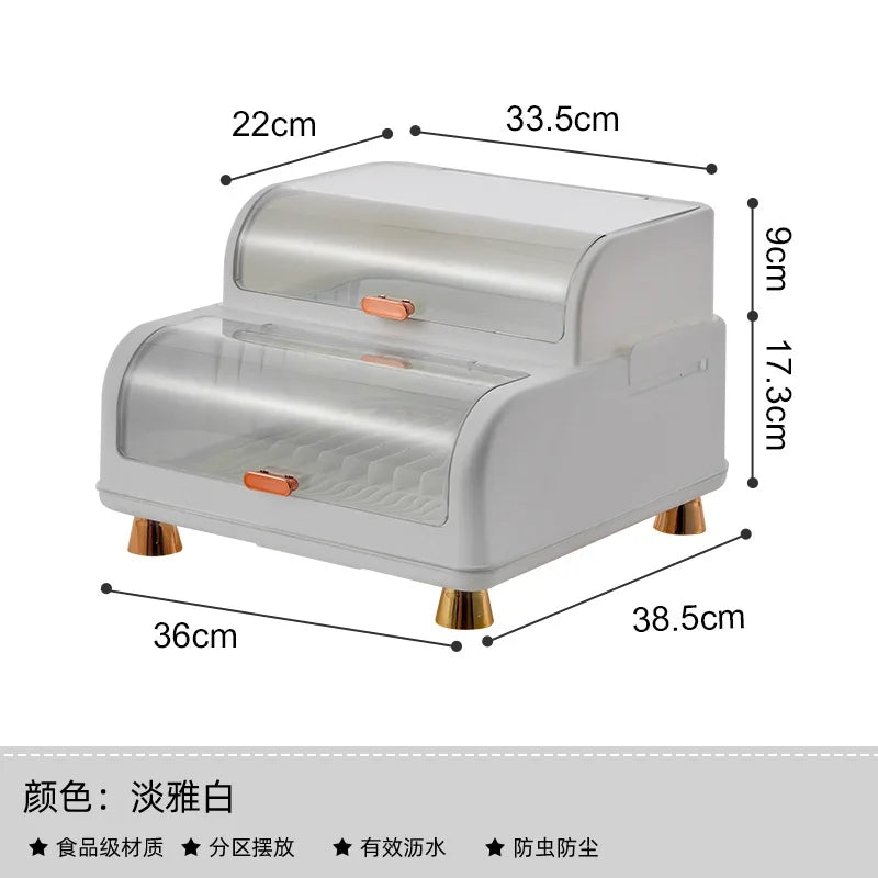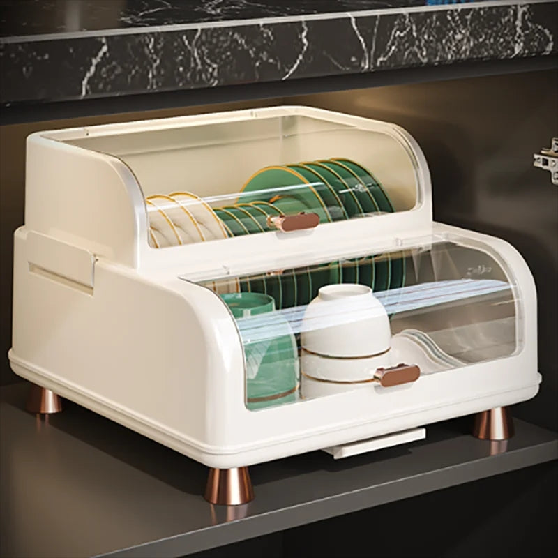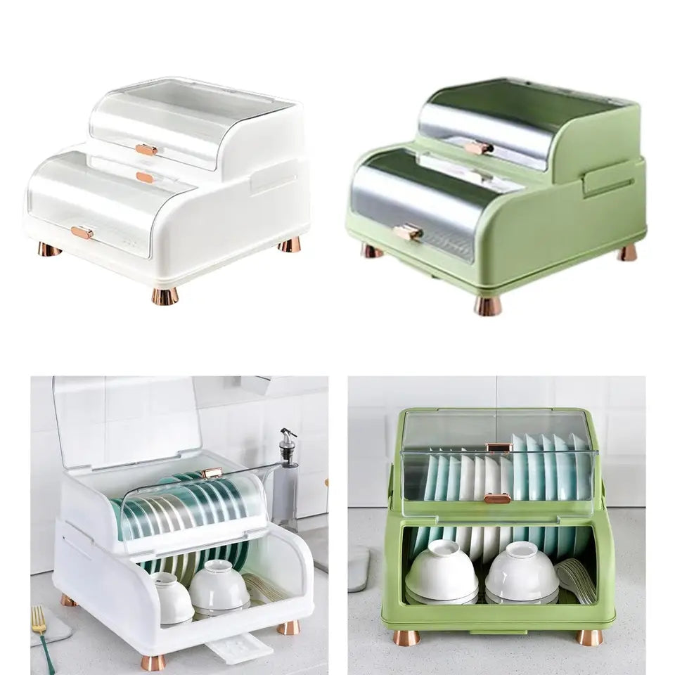 This durable and efficient Dual Layer Dish Rack with Lid is perfect for organizing your kitchen and saving space. The two layers allow you to store twice as many dishes, while the lid keeps them clean and protected. Save time and effort with this essential kitchen tool.