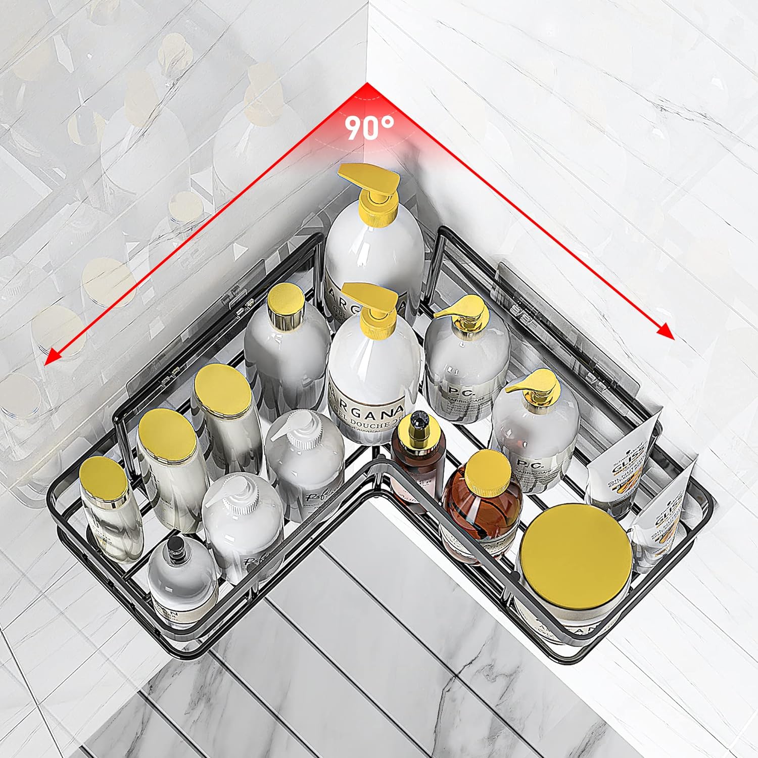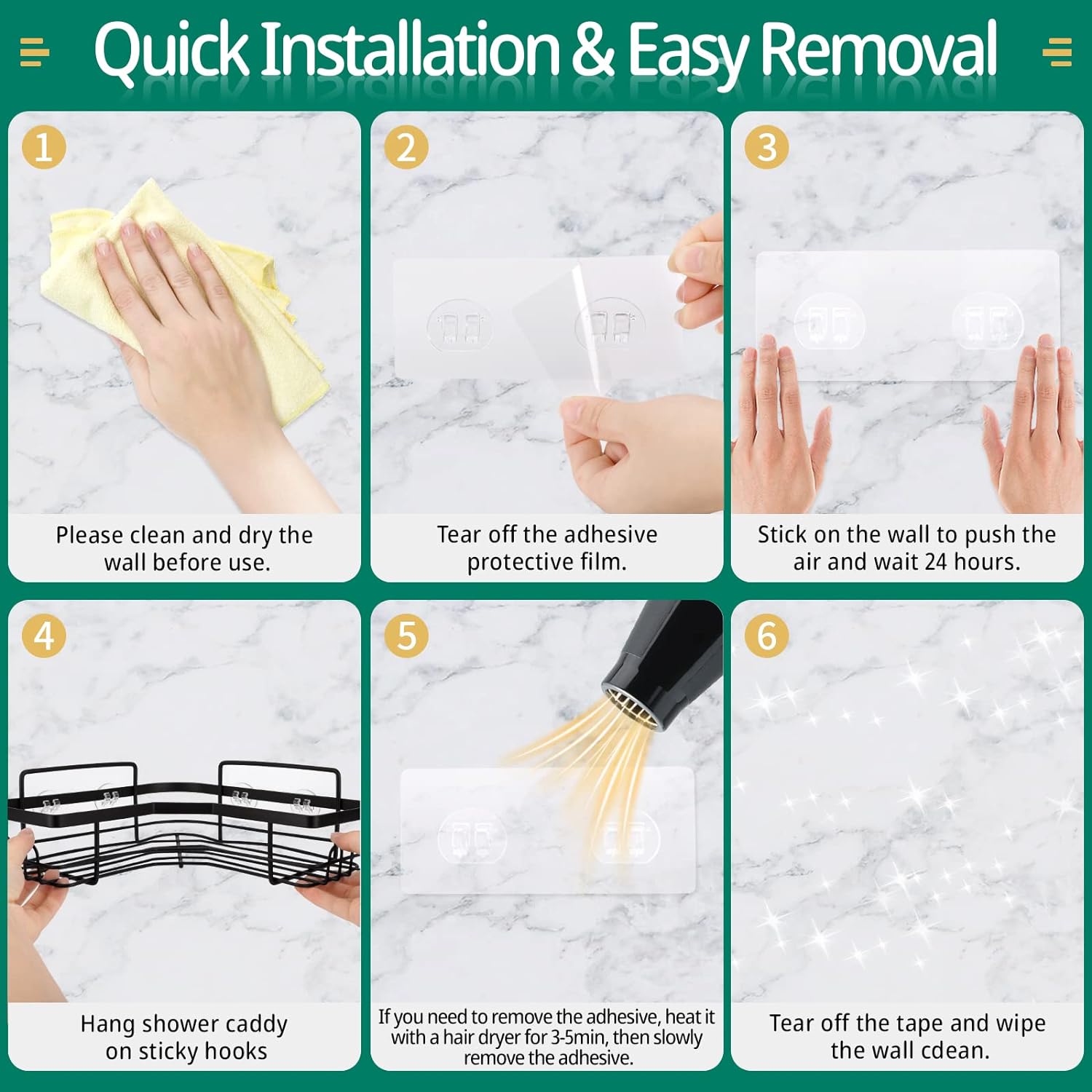 This set of 5 black shower shelves includes 2 shower boxes, 2 brackets for soap, 1 support for toothbrushes and 5 adhesives. The front hook can be used to hang sponges, towels, hair laces, razor groping and mouthwash cups, saving plenty of space. The high-capacity bathroom organizing shower can store all your bathroom supplies. In addition, shower shelf suitable for bathroom, kitchen, tool room, etc. Take on many different roles to meet your needs. They are made of high quality SUS 304 stainless steel, waterproof, rust resistant, scratch-resistant, these shower shelves for tile walls are durable and they are easy to install with their self adhesive stickers. The modern hollow design makes the shower shelf more convenient to ventilate and empty to keep your things ventilated and dry, moisture-proof. The triangular design makes better use of the corner area.