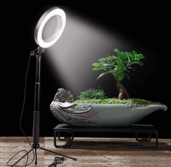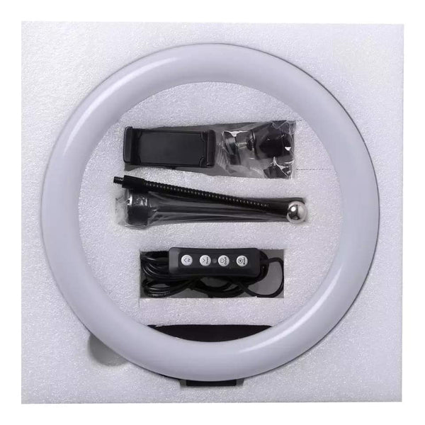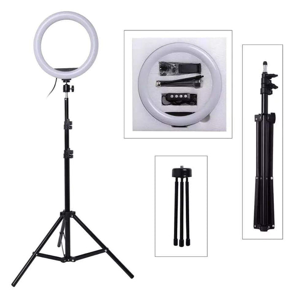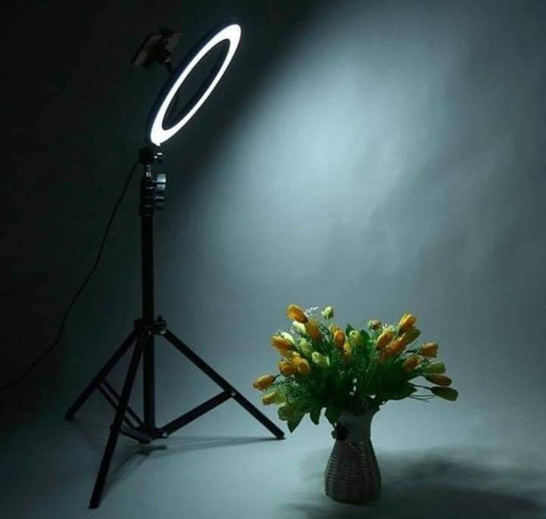 Mini studio ring light with stand. Light containing 3 models of light white, warm white, Cold white and also have an option to reduce and increase light effect. Stand size is approx 7ft in height. There are three sizes in ring light 23cm, 33cm and 36cm. 23cm and 36cm size have 3 modes of light as mentioned above and 33cm light contain RGB light with multiple color of light.