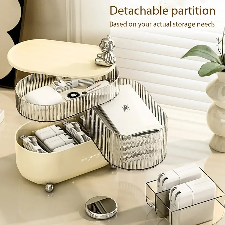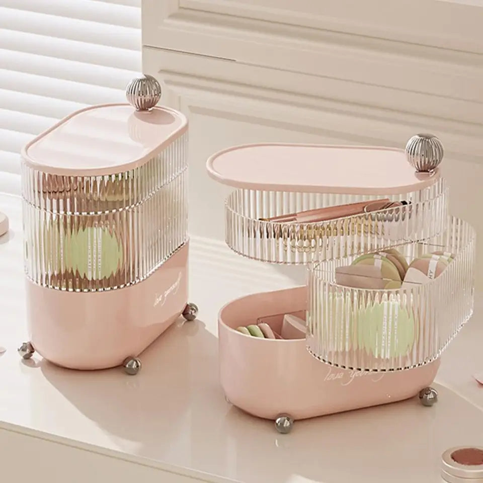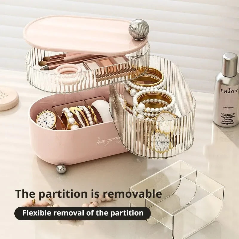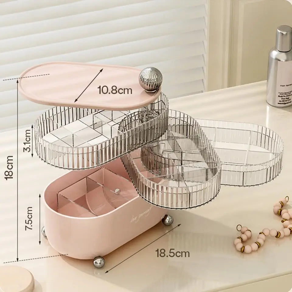 A multi-layer rotating desktop cosmetic organizer is a functional and stylish storage solution designed.