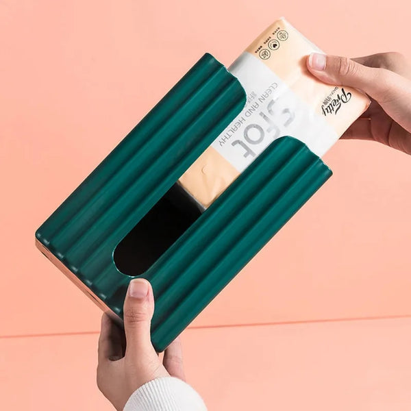 Self adhesive tissue box with an option of rack on it. Can be placed of flat surface or you can mount that on wall