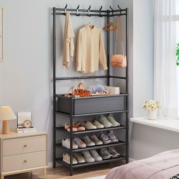 【COAT RACK WITH SHOE STORAGE】 This is the perfect combination of shoe rack, coat rack and other small items storage organizer. hang hats, clothes, accessories, scarves, keys and more. Shoe rack with coat hanger let you quickly find what you need before going out, let you no longer panic before going out.