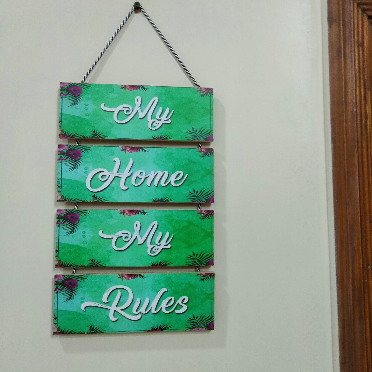 Add a touch of style and personality to your space with the My Home My Rules - Home Wooden Hanging. Made from high-quality wood, this hanging features the phrase "My Home My Rules" in bold lettering, creating a strong statement for your home décor. Perfect for any room, this hanging is a must-have for every home.
