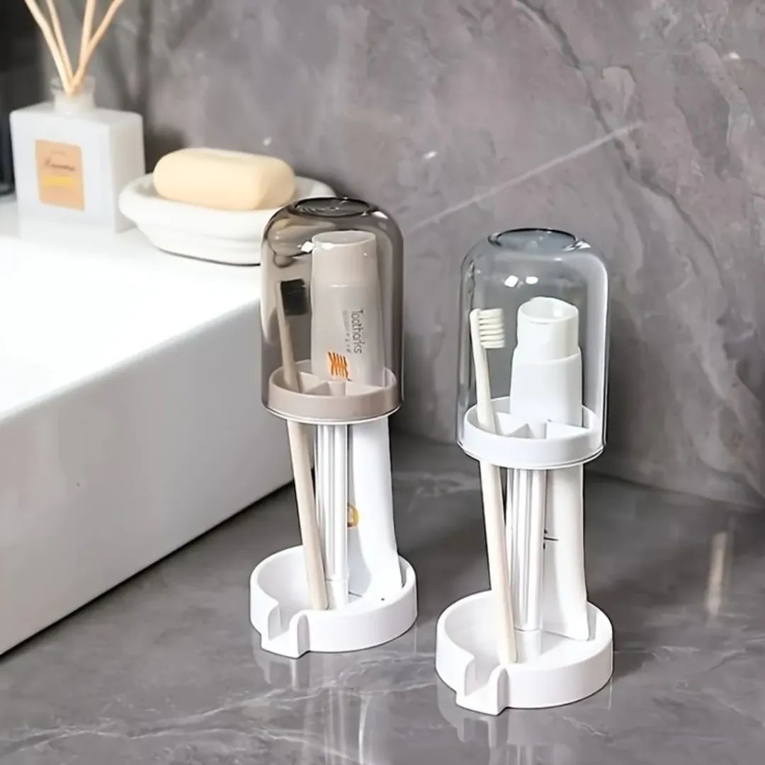 This portable toothbrush holder with mouthwash cup is a multifunctional bathroom organizer designed to save space while keeping your essentials neatly arranged. It features dedicated compartments for storing toothbrushes and toothpaste, along with an integrated cup for mouthwash or rinsing. The sleek design includes a dust cover to maintain hygiene and protect toothbrushes from contaminants. Ideal for both home and travel use, this compact storage shelf enhances bathroom organization with its convenient and stylish layout.