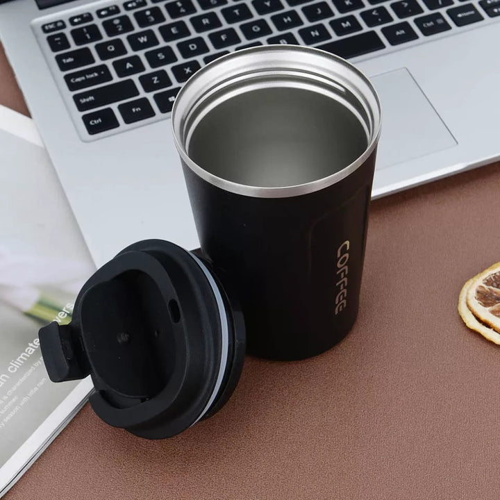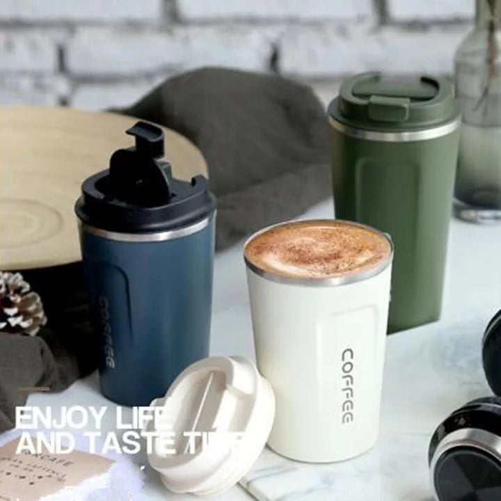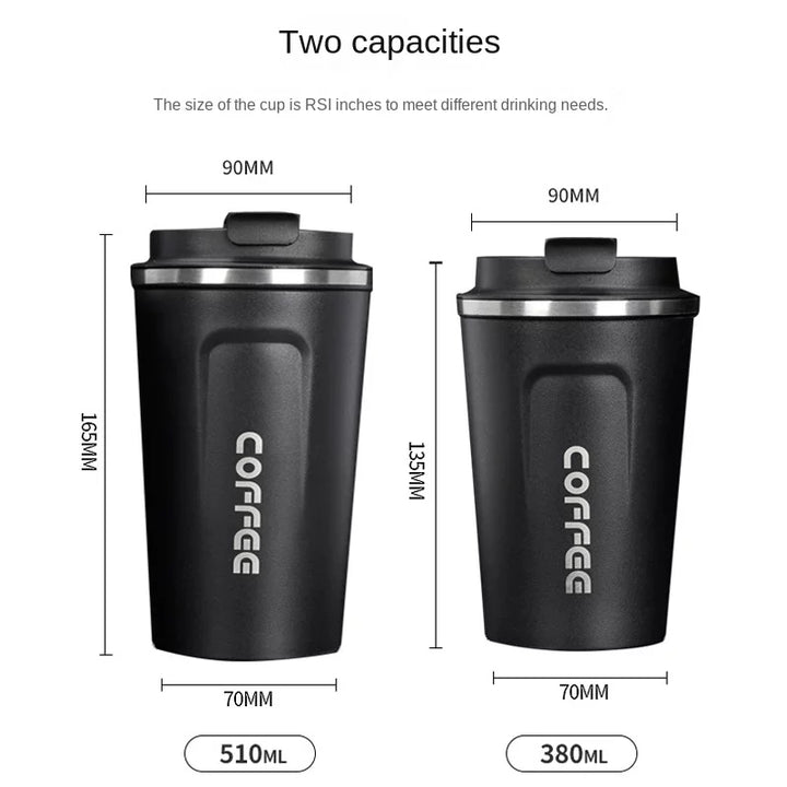 Stainless steel coffee mug set in 2 different sizes in stock and 2 different colors. Can keep liquid warm for 6 to 10 hours capacity 380ml:14.8*8.8cm , 510ml:17.5*8.8cm