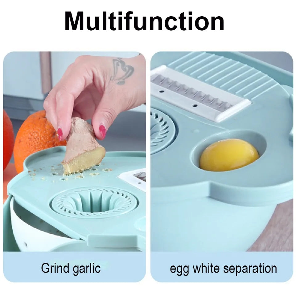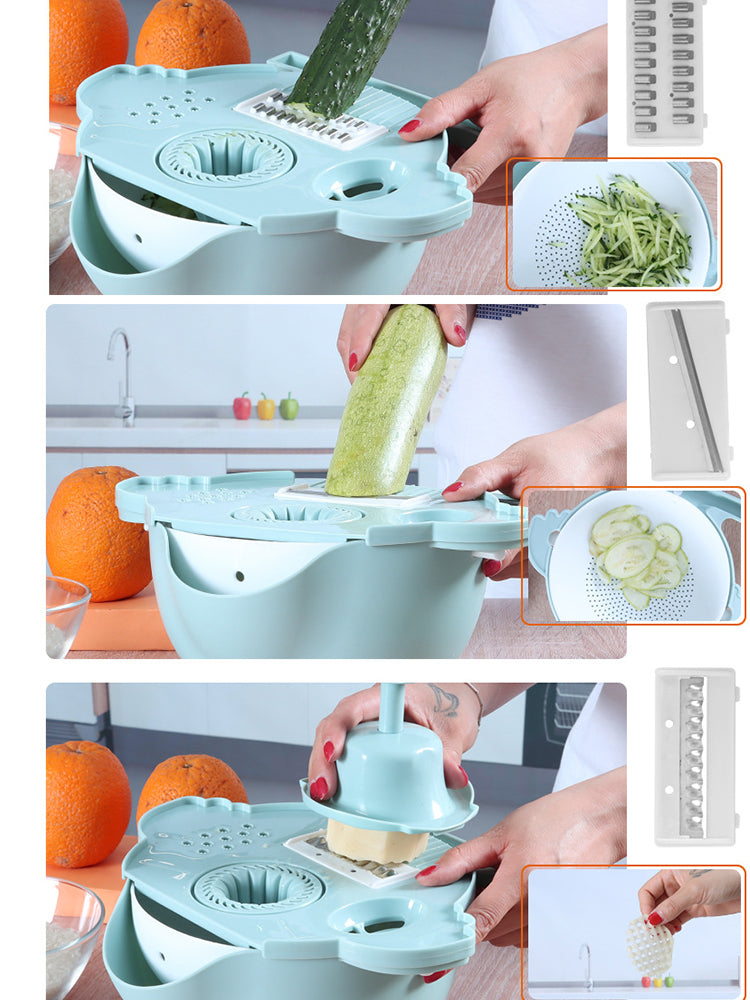 Functions: shred, slice, grind ginger, cut flowers, drain and wash vegetables, beat the skin, separate egg whites, squeeze juice, mobile phone holder (can be used as a fruit plate alone).