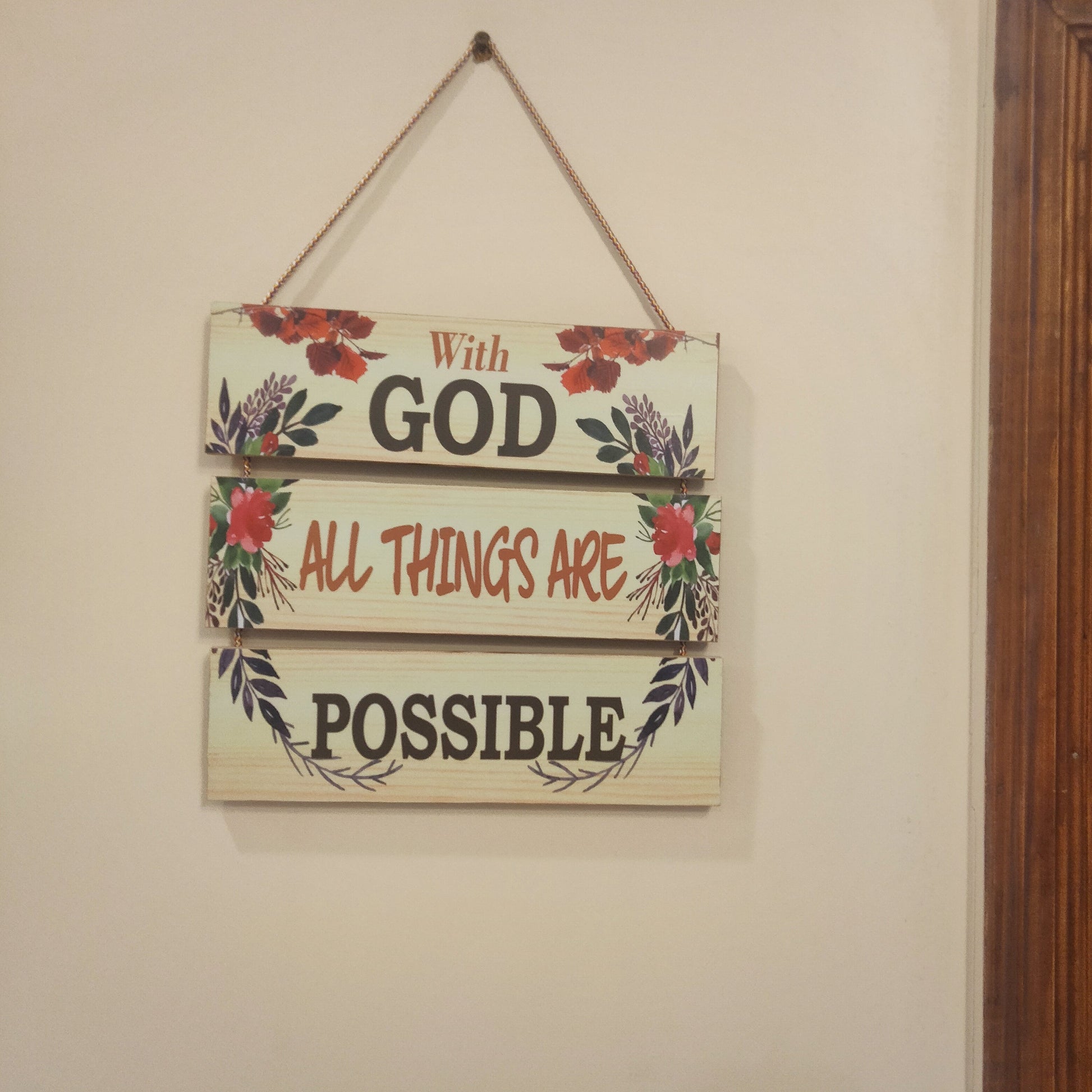 Bring positive vibes into your home with this inspiring wall hanging. This decoration features the well-known bible quote "With God All Things Are Possible" in an elegant font and is made out of high-quality materials to ensure durability and a timeless look.